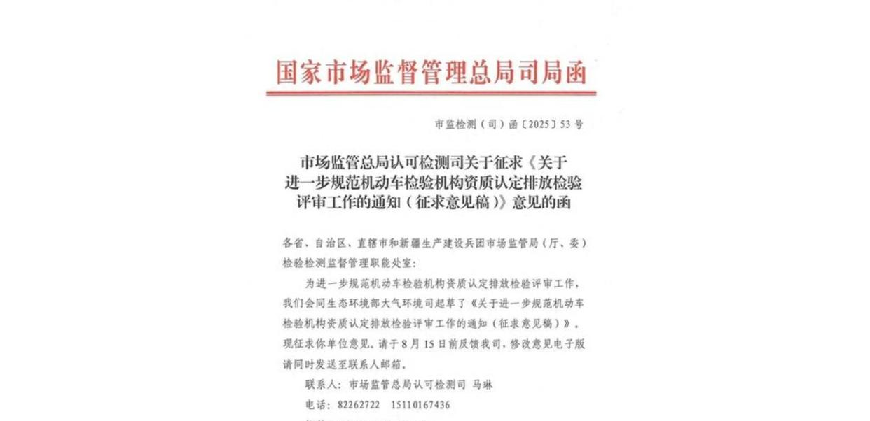 2025年9月9日,市场监管总局发布公告称,为进一步规范机动车检验机构资质认定排放检验评审工作,市场监管总局会同生态环境部起草了《关于进一步规范机动车检验机构资质认定排放检验评审工作的通知(征求意见稿)》,现向社会公开征求意见,反馈意见截止日期为2025年10月8日。新规要求各地市场监管部门在组织机动车检验机构资质认定现场评审时,评审组必须包含熟悉机动车排放检验技术及管理的专家。这些专家由省级生态